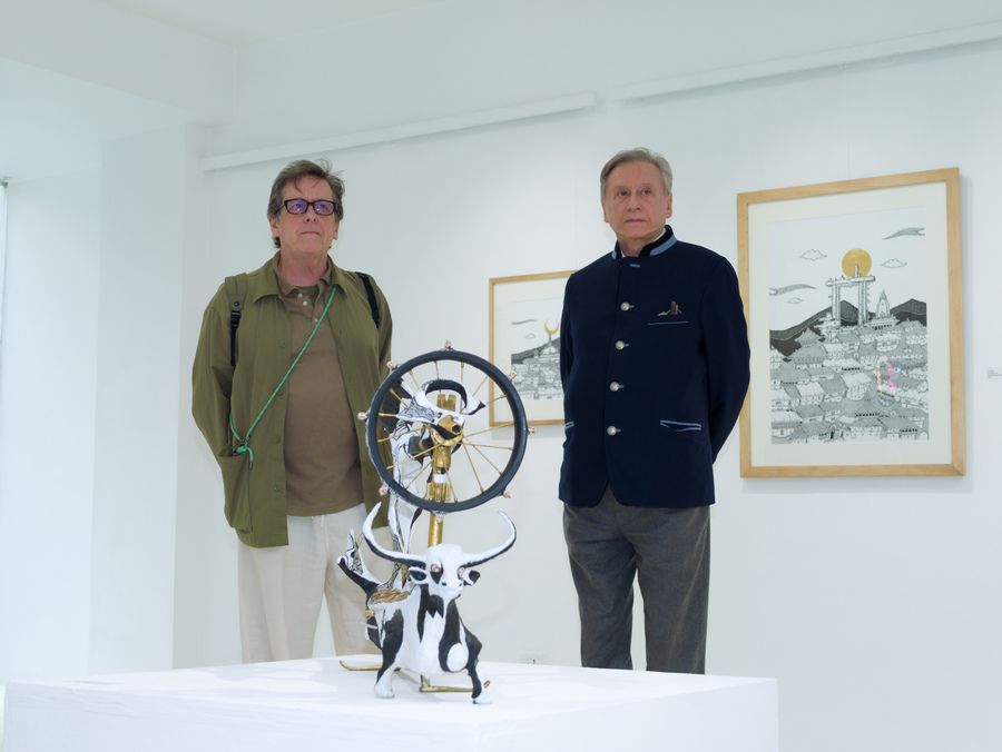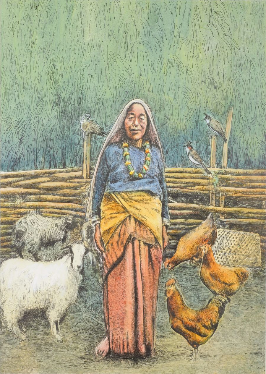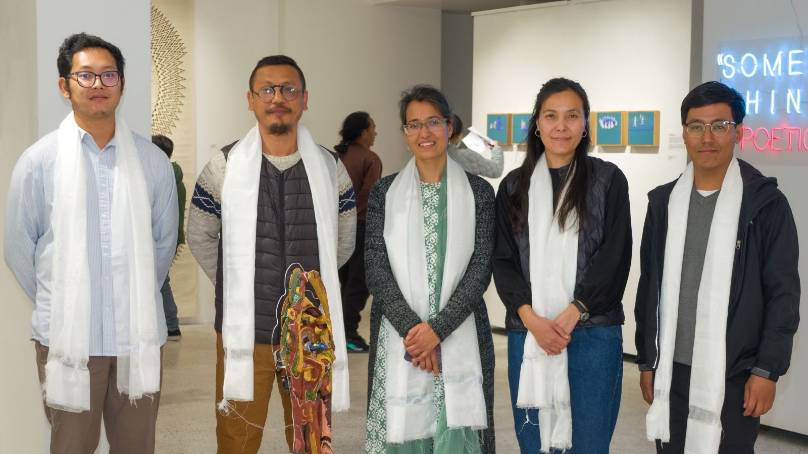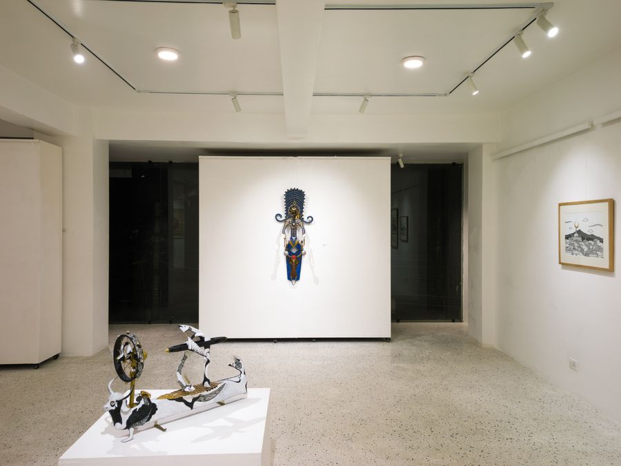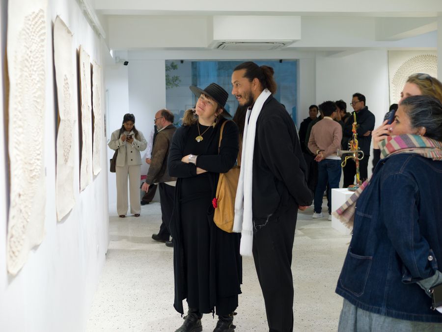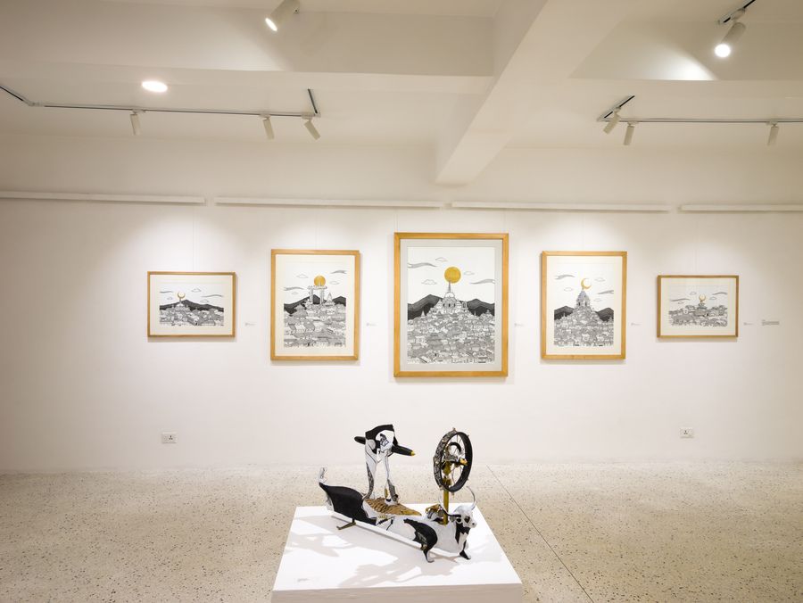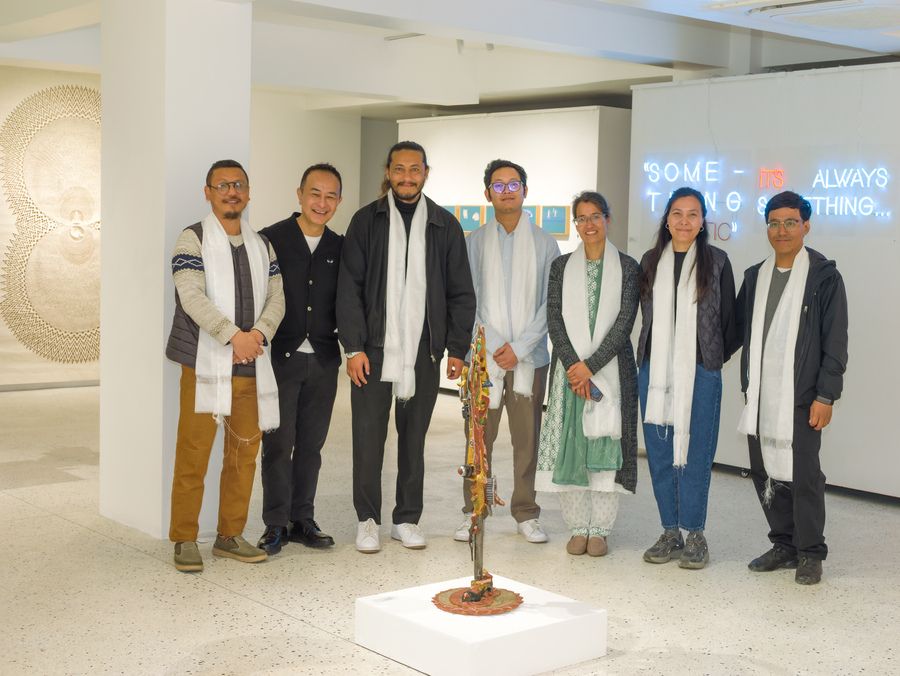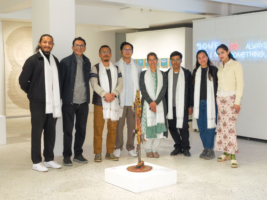 It is rare to catch a familiar artist in the act of turning from one mode of watching the world toward another of seeing new facets of their artistic selves and practices. Artists presented here are well-known to most patrons of the arts in Kathmandu, but the works displayed contain surprising new perspectives into how they are thinking and creating in this moment. Most urgency has been displaced by quiet meditation, wit is morphing into wisdom, and the vernacular of a new visual lyric is arising to arrest and surprise the attentive viewer. In these works, the political crosses path with the personal in neon letters, the personal becomes something public and celebratory with moments of play and participation, and everything also rises toward the historic and the mythic, as omnipresent as gods are in the detritus of our lives, and as ubiquitous as the silhouette of a tired, eternal cityscape.